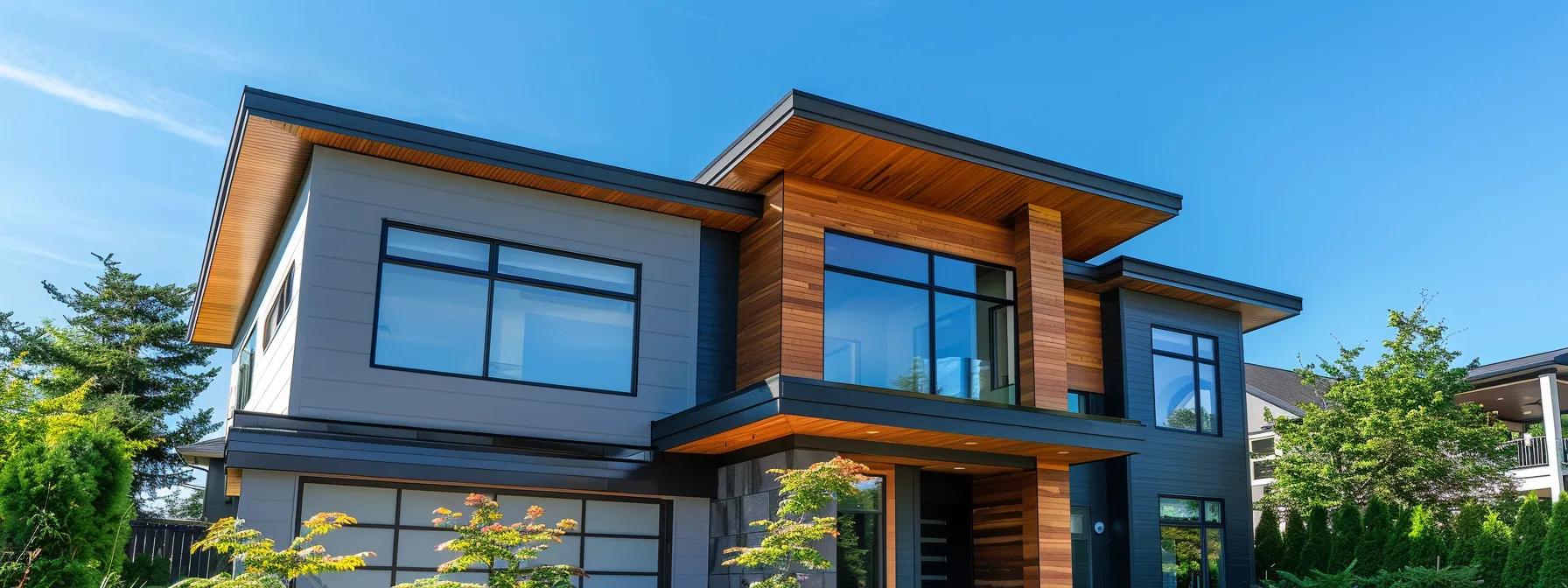 a contemporary suburban house in west virginia, showcasing a variety of siding materials like fiber cement, vinyl, and wood, set against a clear blue sky, emphasizing durability and aesthetic appeal for homeowners.